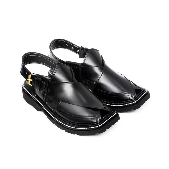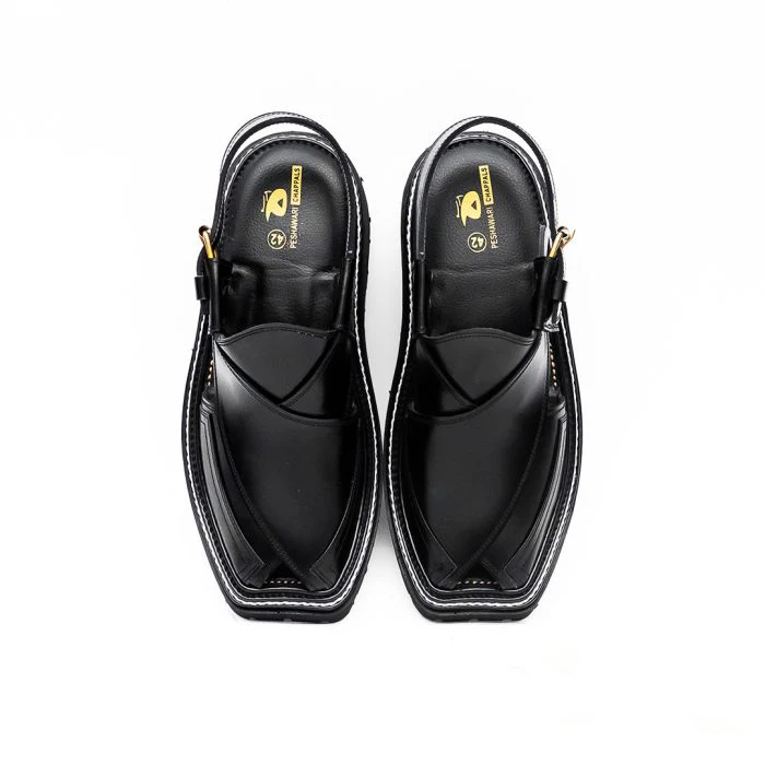 Step into timeless elegance with the Handmade Black Peshawari Chappal, featuring a sleek design, durable Vibram sole, and striking contrast lining. Crafted by skilled artisans using premium black leather, this chappal exudes tradition while offering modern comfort and durability, making it perfect for both everyday wear and special occasions.